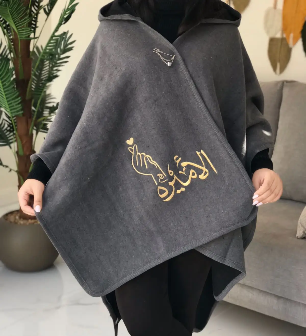 يتميز الشال بمقاس موحد يناسب الجميع، ويمكن تخصيصه بتطريز الاسم أو عبارة حسب الطلب.