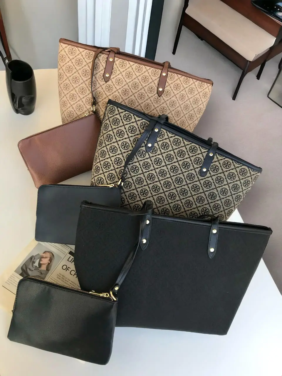 تألقي مع شنطة توري بورش دبل فيس الكبيرة مع بوك صغير، التي تأتي بتصميم وجهين لتمنحك مظهرين مختلفين في قطعة واحدة.