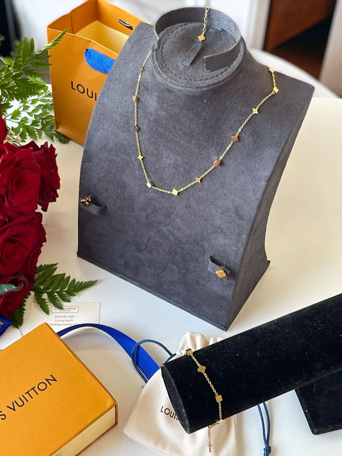 نقدم لكم طقم سلسال واسوارة وحلق من ماركة لويس فيتون الراقي والفاخر. تمتعي بالتميز والأناقة في وقت الموضة مع هذا الطقم الرائع.