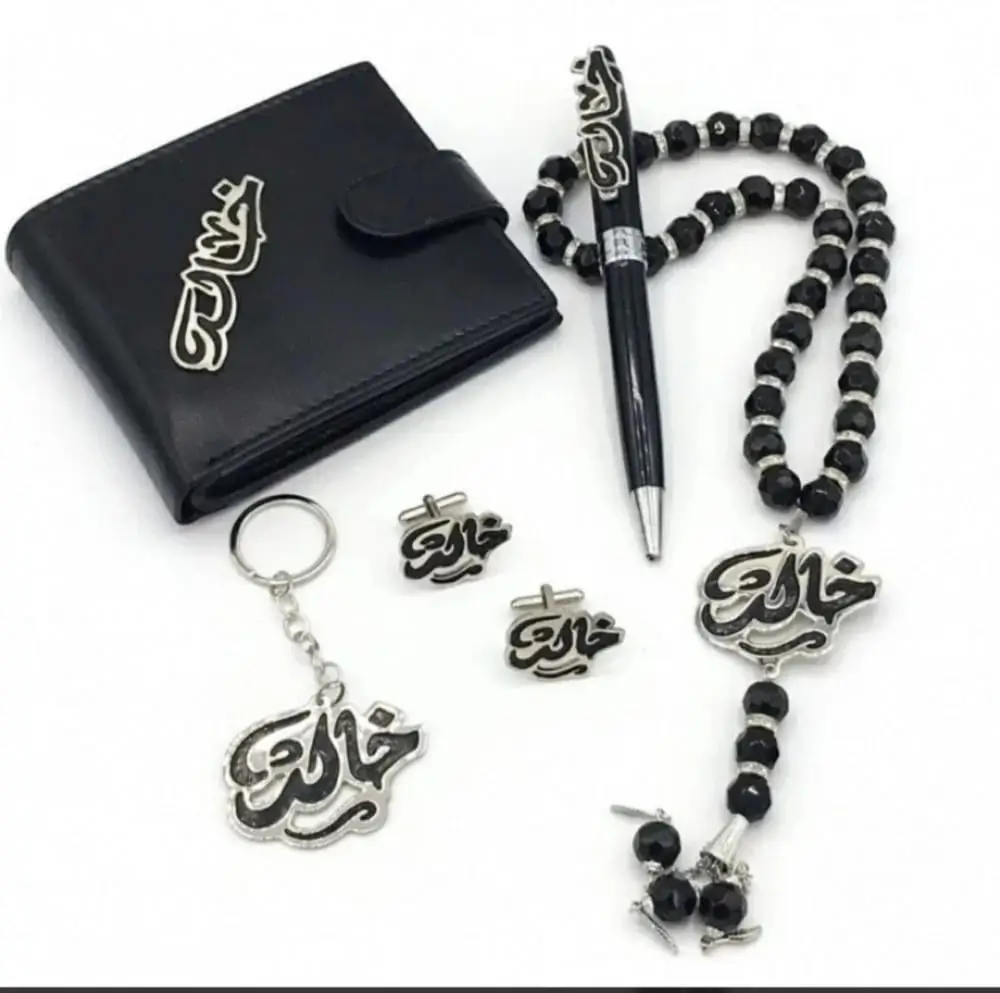 يشمل الطقم كبك، محفظة، قلم، سبحة، وميدالية. كل قطعة مصممة بعناية فائقة وتحمل لمسات فنية رائعة.