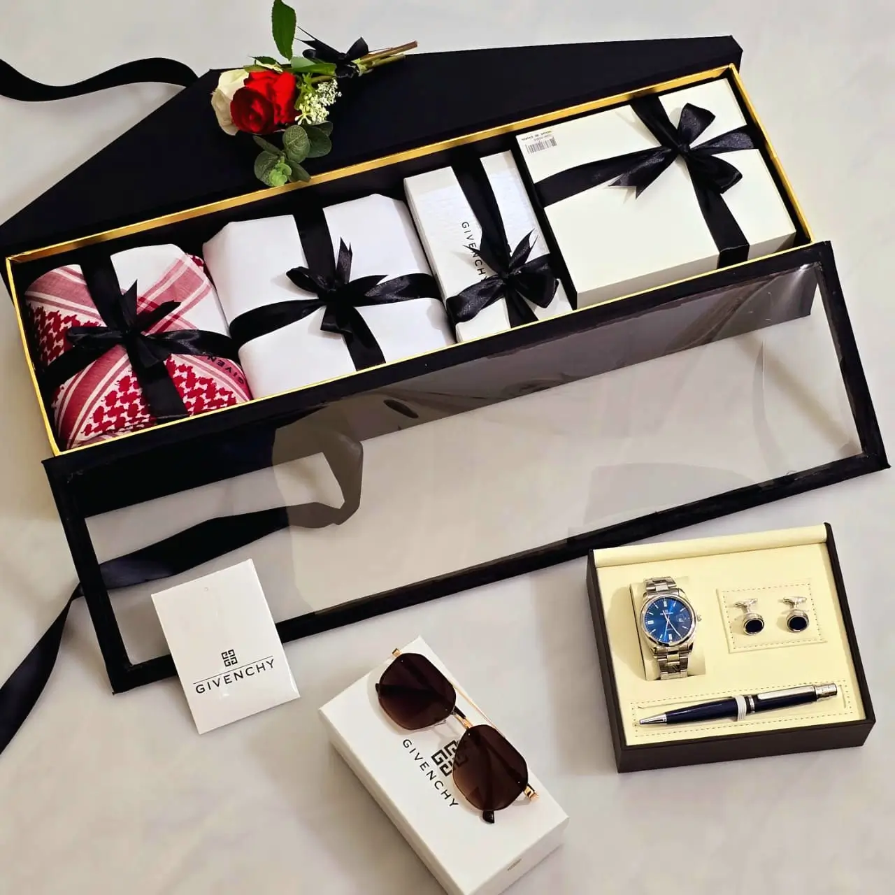 اهدي أحبائك بوكس هدي رجالي فخم يتكون من قماش جفنشي الفاخر، شماغ جفنشي بنسبة 100% من القطن، طقم ساعة بتصميم رولكس وضمان لمدة سنة، نظارة جفنشي مع الملحقات، وتنسيق ورد جميل.
