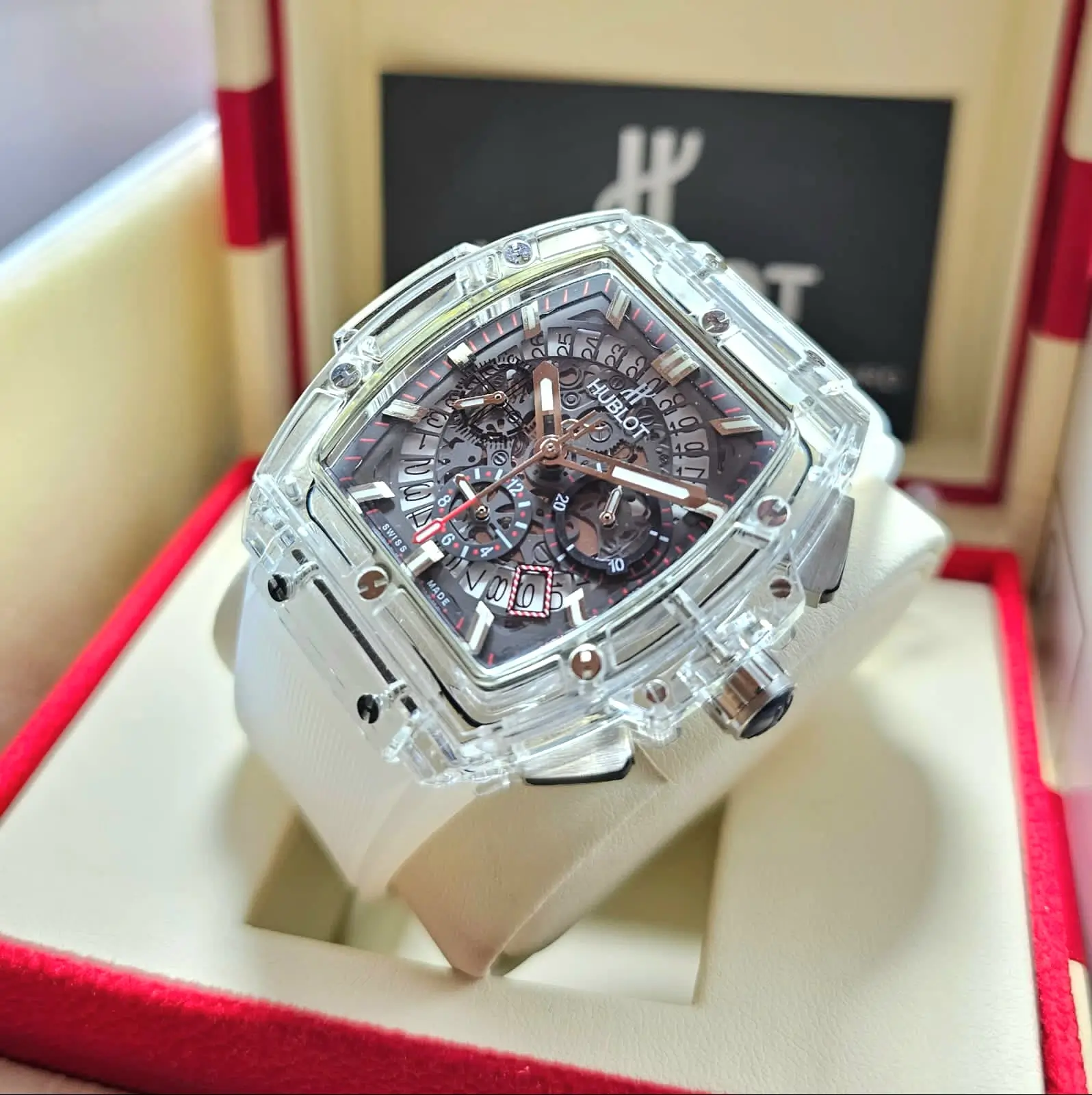 استعد للتميز مع ساعه هوبلت الرجاليه الشفافه التي تأتي بنظام اوتوماتيك ذات التصميم المستطيل.