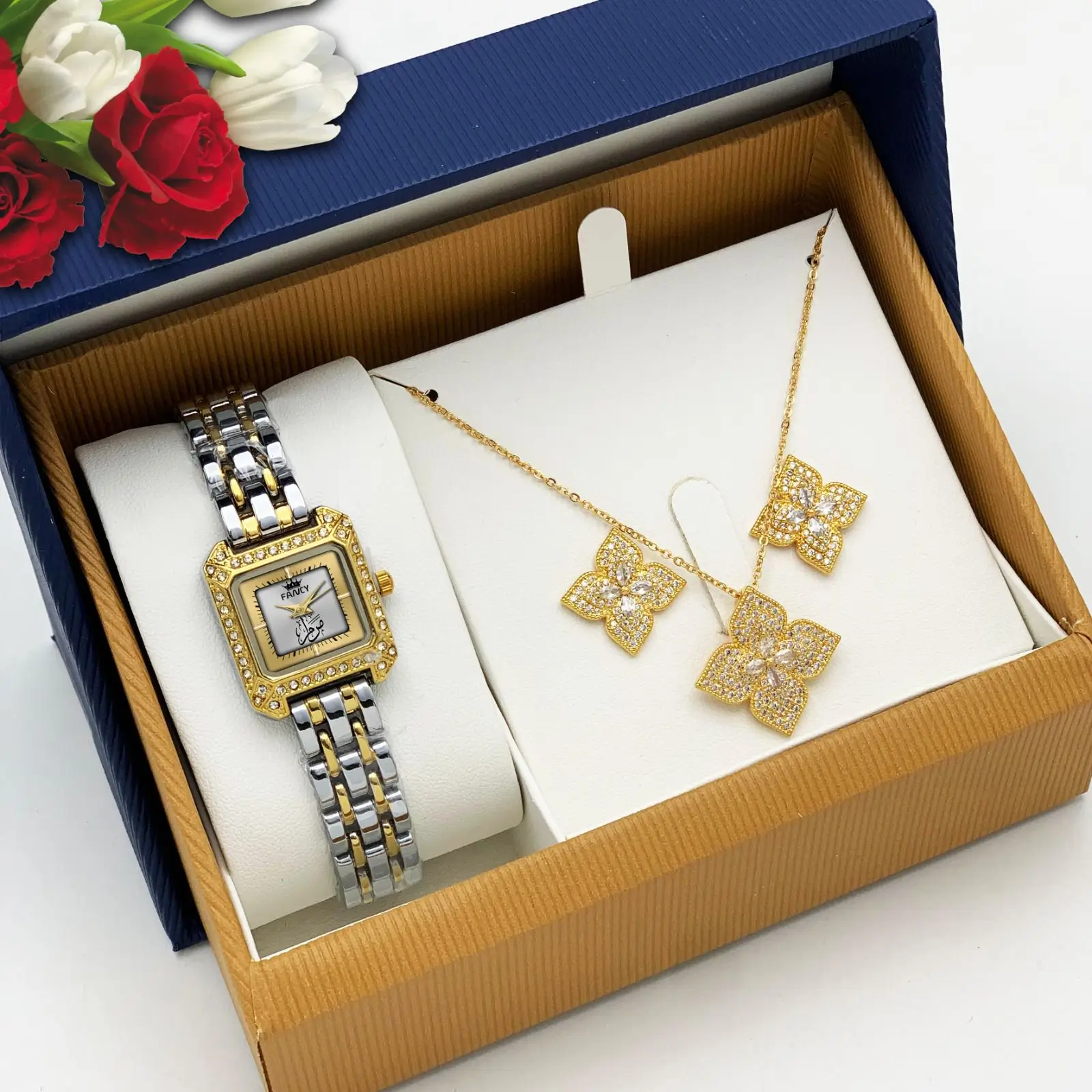 اجعل هديتك مميزة مع طقم ساعة نسائي بالاسم من ماركة فانس، تصميم اسم حسب الطلب. يتكون الطقم من: