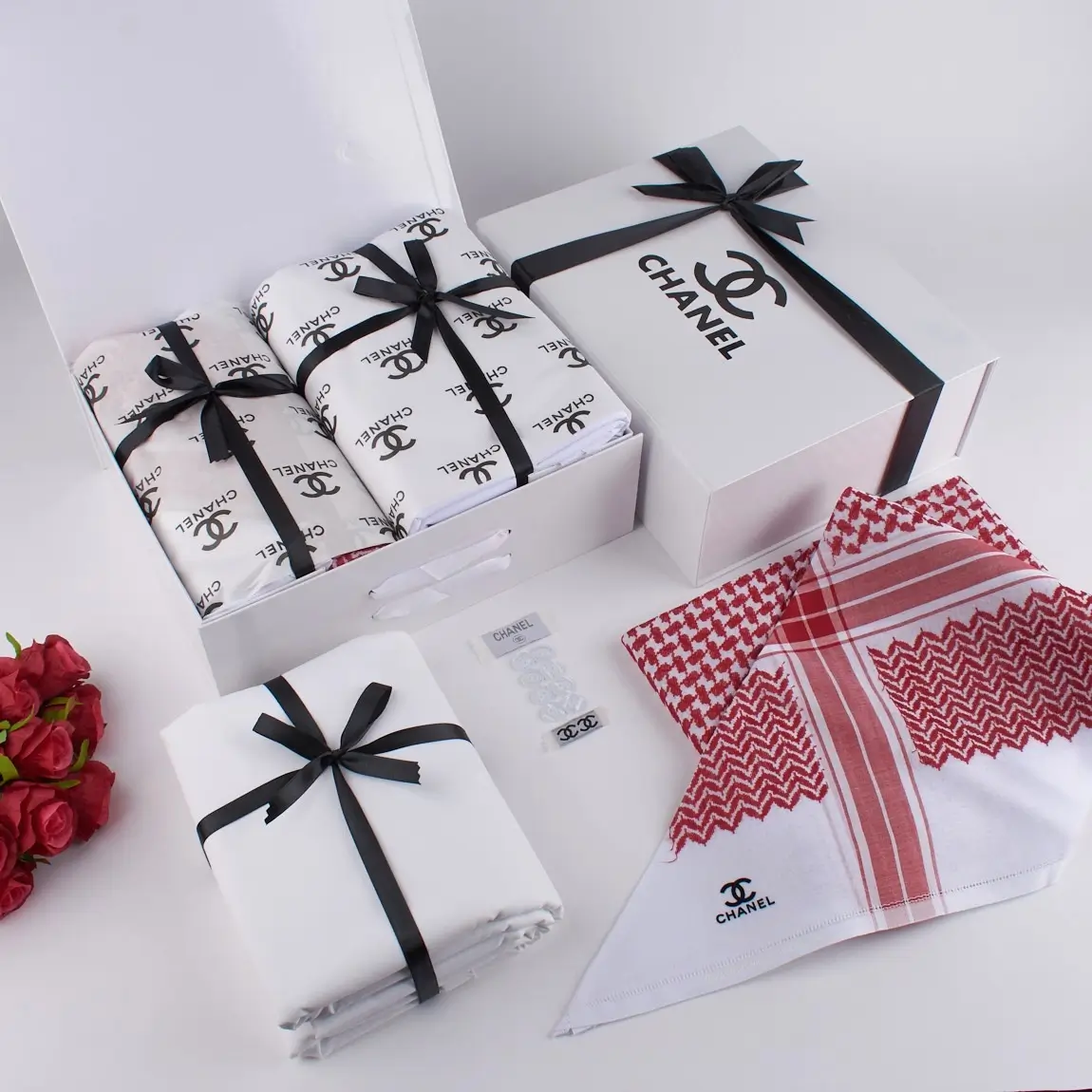 استمتع بالأناقة مع طقم شماغ وقماش فاخر من ماركة شانيل. يحتوي الطقم على: