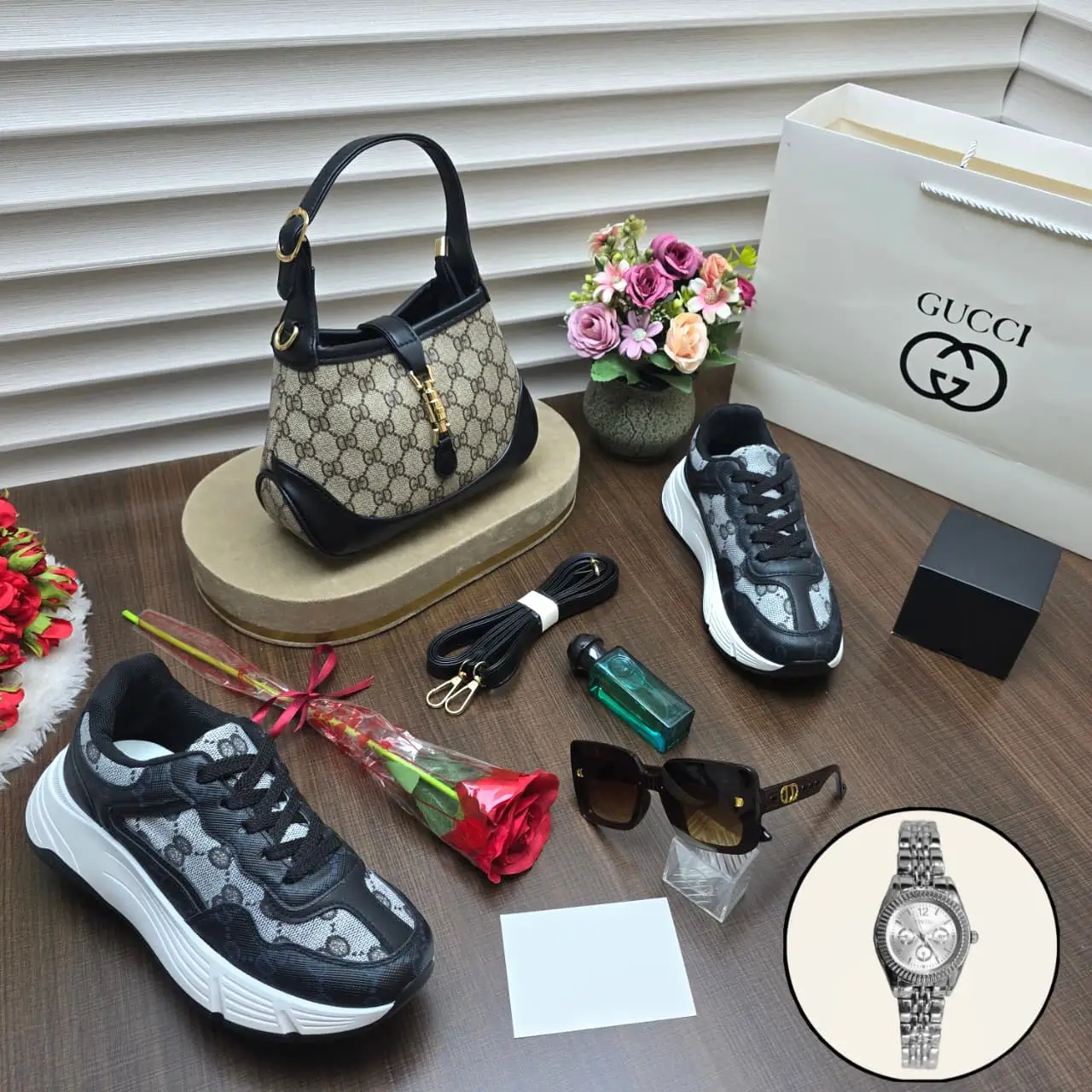 تألقي بإطلالة أنيقة مع بكج نسائي شنطة ماركة قوتشي مع شوز وساعة ونظارة يضم مجموعة متكاملة من القطع الراقية التي تجمع بين الفخامة والجودة العالية.