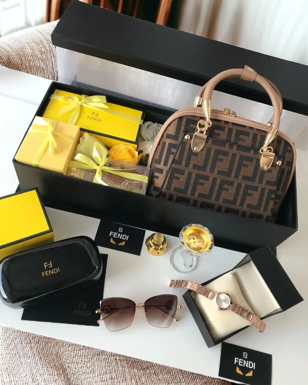 قدم هدية مميزة وراقية مع طقم هديه نسائي من ماركه فندي، يتكون من شنطة تصميم الفندي، نظارة فندي، ساعة فندي، مبخرة راقية زجاجية، ربطات شرايط راقية، وعبارة بطلب. استمتع بالأناقة والفخامة مع هذا الطقم الرائع.