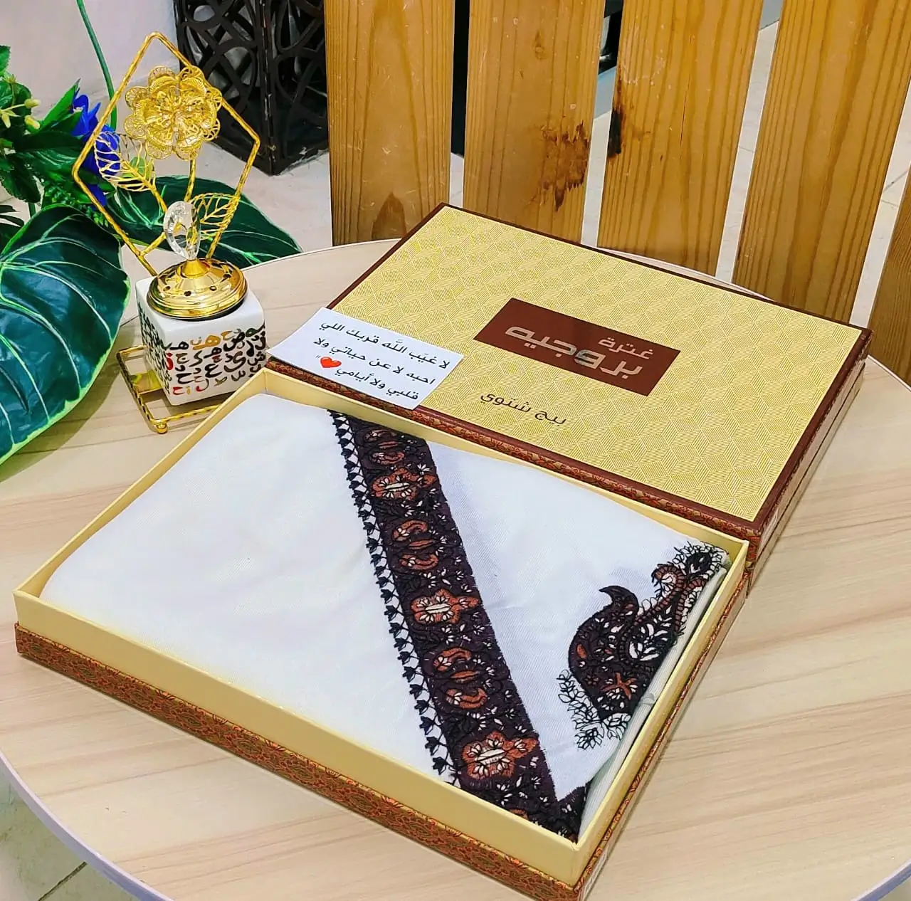 يتم تقديم الغترة مع مبخرة هدية، ويمكن إضافة كرت عبارة مخصصة حسب الطلب لإضفاء لمسة شخصية فريدة.