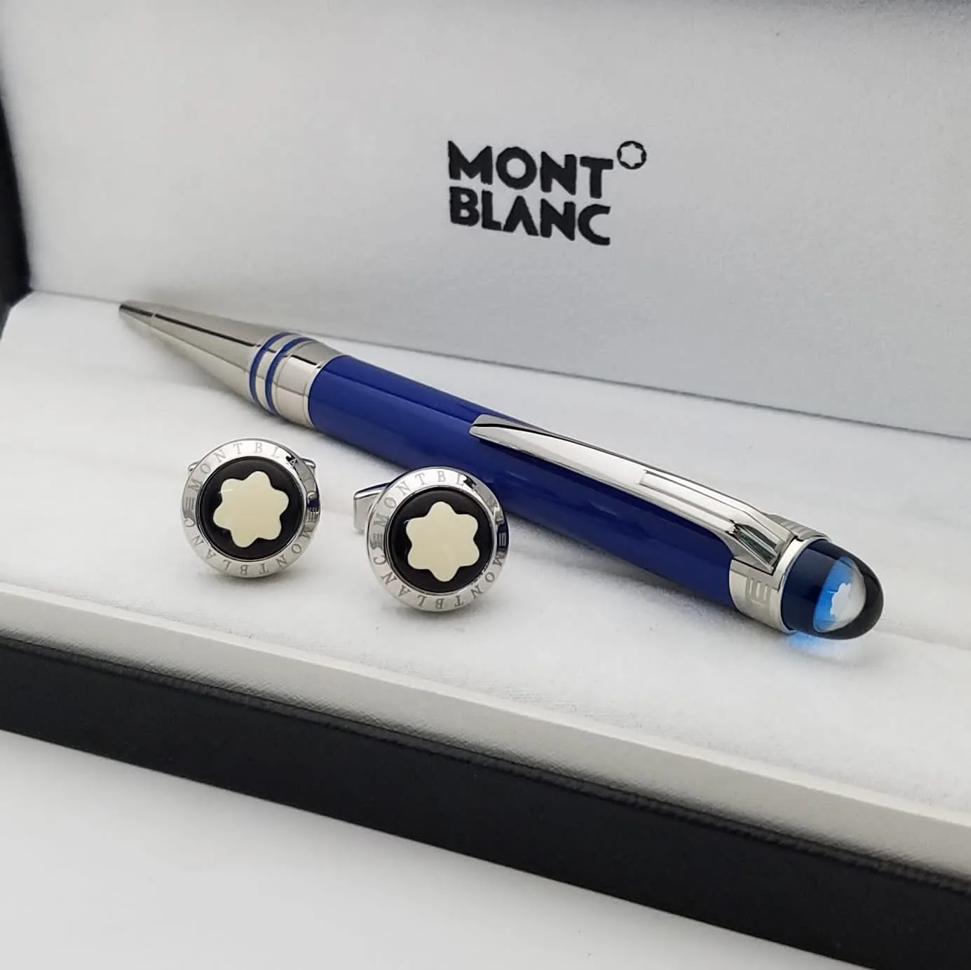 استمتع بالأناقة والتميز مع قلم وكبك مونت بلانك. يتميز هذا بجودته العالية والتصميم الراقي.