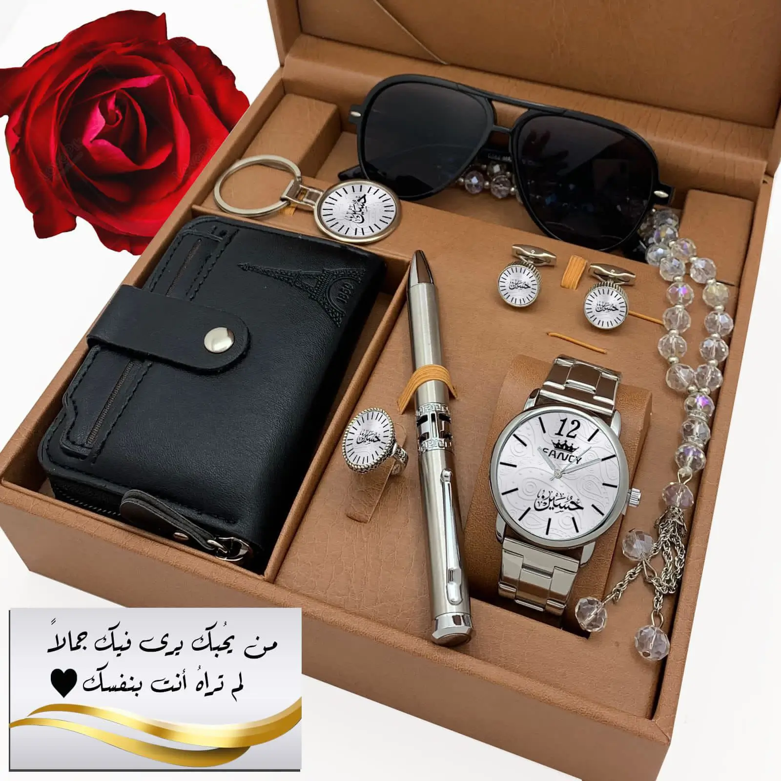اطقم هدايا بالاسم رجاليه تصميمات مخصصة حسب الطلب للساعات، الكبك، الميداليات، الخواتم، الأقلام، المحافظ والنظارات الشمسية. توفر علبة طقم فاخرة وكيس كرتوني لتقديم الهدية بشكل جميل. ضمان لمدة سنة لضمان جودة المنتجات.