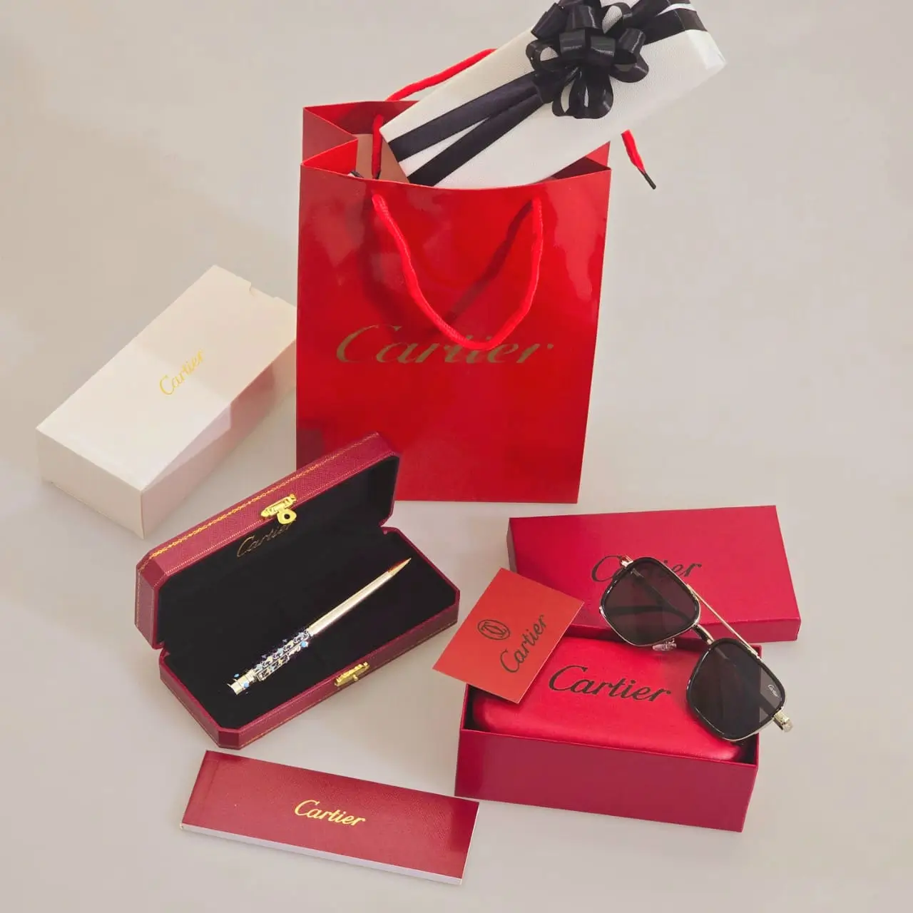 أقوى العروض طقم هدية قلم ونظارة كارتير الفاخر مع جميع الملحقات وتغليف فاخر. احصل عليه الآن واستمتع بالأناقة والفخامة.”